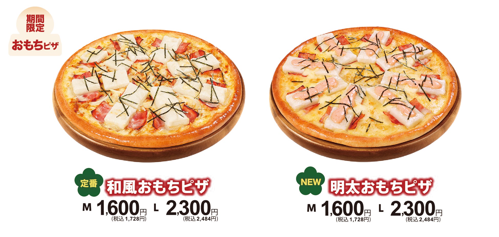新登場!”明太おもちピザ”もおすすめ。北海道産たらこを使った明太マヨネーズとおもち&チーズの相性抜群。2種のおもちピザ食べ比べでお正月を満喫。1月末までの限定販売です!