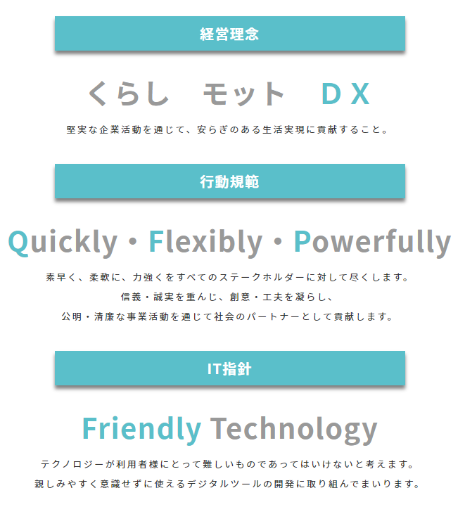 当社は「くらし モット DX」を経営理念として、くらしをデジタルトランスフォーメーションで快適に、テクノロジーがフレンドリーをモットに挑戦してまいります。