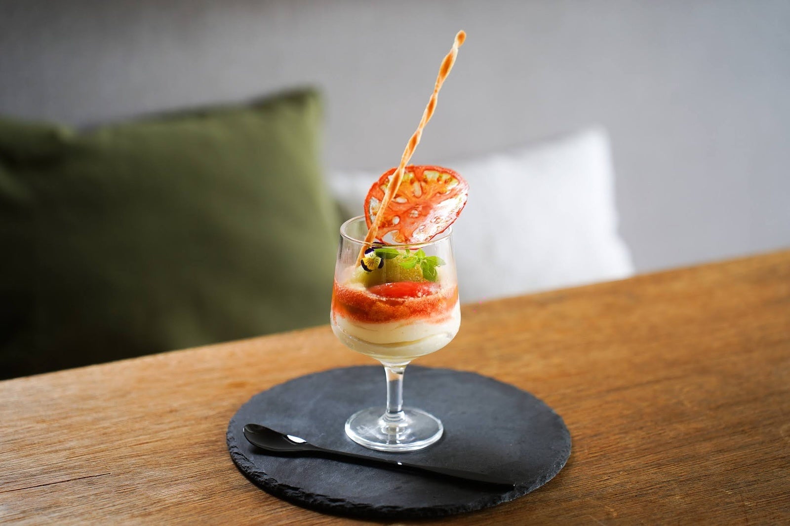 静岡県三島の名産品「三島の味力トマト」が主役のパフェ。糖度が8~9度の高糖度トマトのコンポートと数種類の柑橘、りんごを使ったバジルのシャーベットに、濃厚なクリームチーズムースを重ねて仕上げました。甘味と酸味、そしてハーブの香りが重なり、初夏の森にふさわしい一品です。