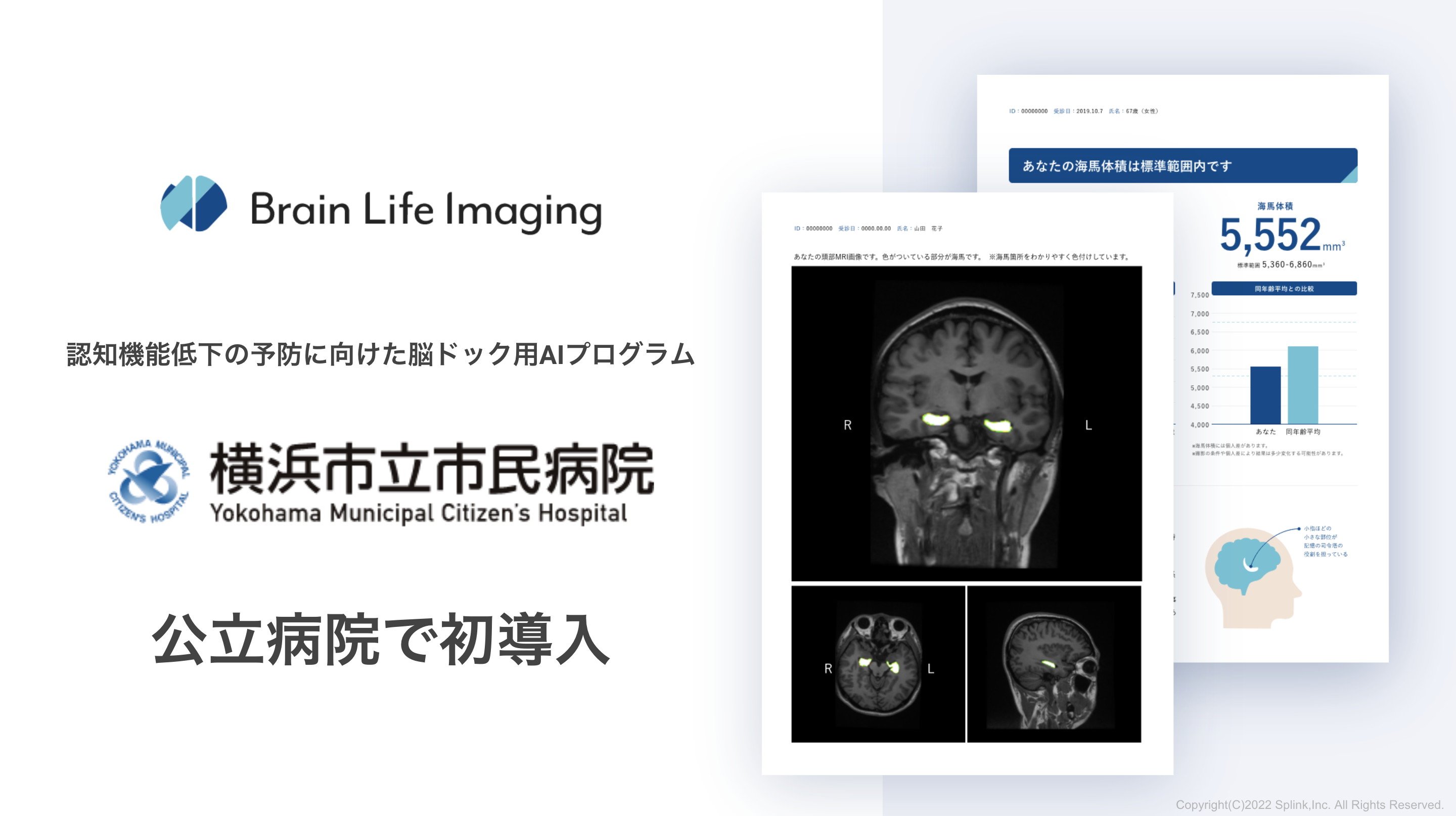 ブレインヘルスケア領域の医療AIスタートアップの株式会社Splink(本社:東京都千代田区、代表取締役:青山 裕紀、以下「Splink」)は、当社が開発・提供する脳ドック用AIプログラム「Brain Life Imaging®(ブレインライフイメージング)」(以下、Brain Life Imaging®)が、横浜市立市民病院(所在地:神奈川県横浜市、病院長:小松 弘一)に導入したことをお知らせいたします。Brain Life Imaging®が公立病院に導入されたのは横浜市立市民病院が初めてとなります。