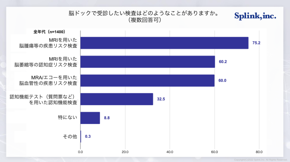 脳ドックで受診したい検査項目は、「MRIを用いた脳腫瘍等の疾患リスク検査」(75.2%)、「MRIを用いた脳委縮等の認知症リスク検査」(60.2%)、「MRA/エコーを用いた脳血管性の疾患リスク検査」(60.0%)。約6割が「脳萎縮などの認知症リスク」を検査したいと回答。