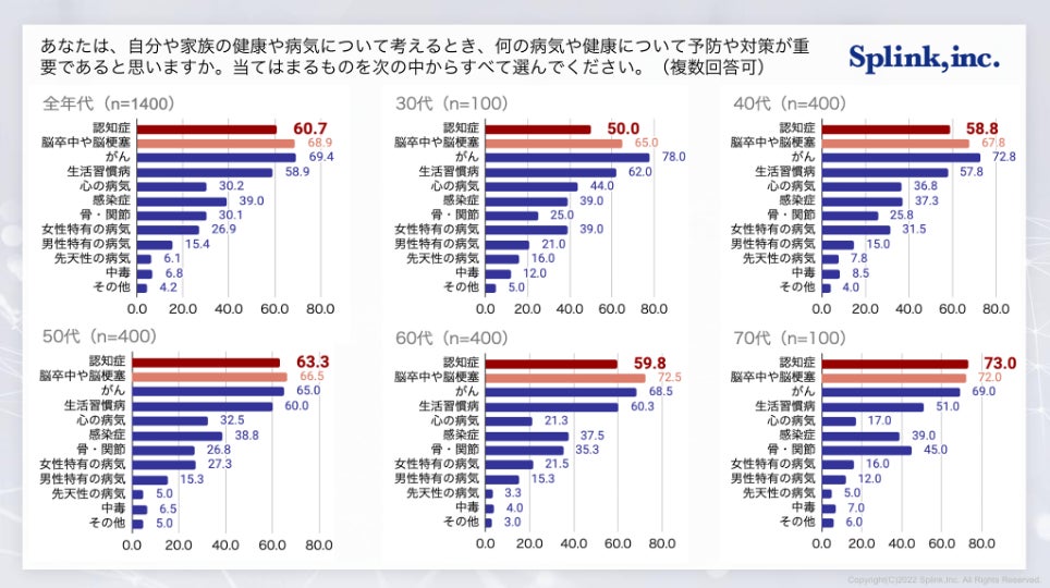 自分や家族の健康や病気について、予防や対策が重要であるものとして、トップ3は「がん」(69.4%)、「脳卒中や脳梗塞などの血管系の脳疾患」(68.9%)、「認知症」(60.7%)と回答。年代別において「認知症」と回答した割合は、30代50.0%、40代58.8%、50代63.3%、60代59.8%、70代73.0%。