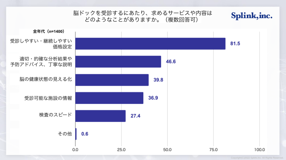 さらに、脳ドックは「値段が高い」ことが受診率向上にむけたハードルとして挙げられてきましたが、本調査では価格設定のほかに「適切・的確なアドバイス、丁寧な説明」「脳の健康状態の見える化」など受診者様目線のわかりやすさが、脳ドック受診で求められていることが明らかとなりました。受診者様が「知らなかった」や「受けてよかった」につながるような、脳の健康情報を、見やすく、理解しやすいレポートを必要としていることがわかります。