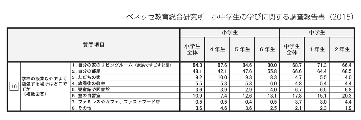高校生の勉強場所についての調査結果を調べると、“「自分の部屋」で勉強する人が全体の71%で最も多かった。” 次いで、「自宅のリビング」と回答する生徒が多かった。また、それ以外の学習場所として多かったのが、学校の教室、図書館、塾の自習室と続きます。小中学生の勉強場所についての調査結果は、「自宅のリビング」と回答する生徒が多く、次いで「自分の部屋」という結果でした。