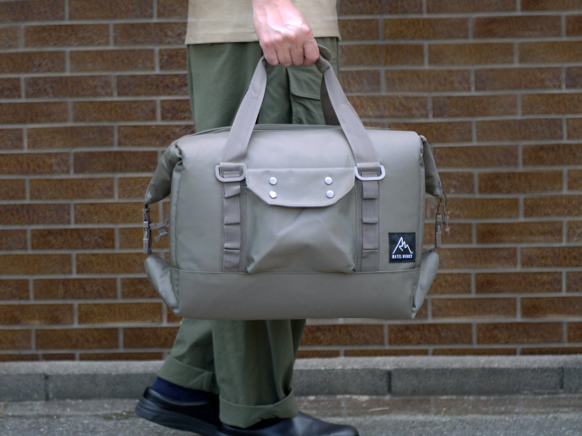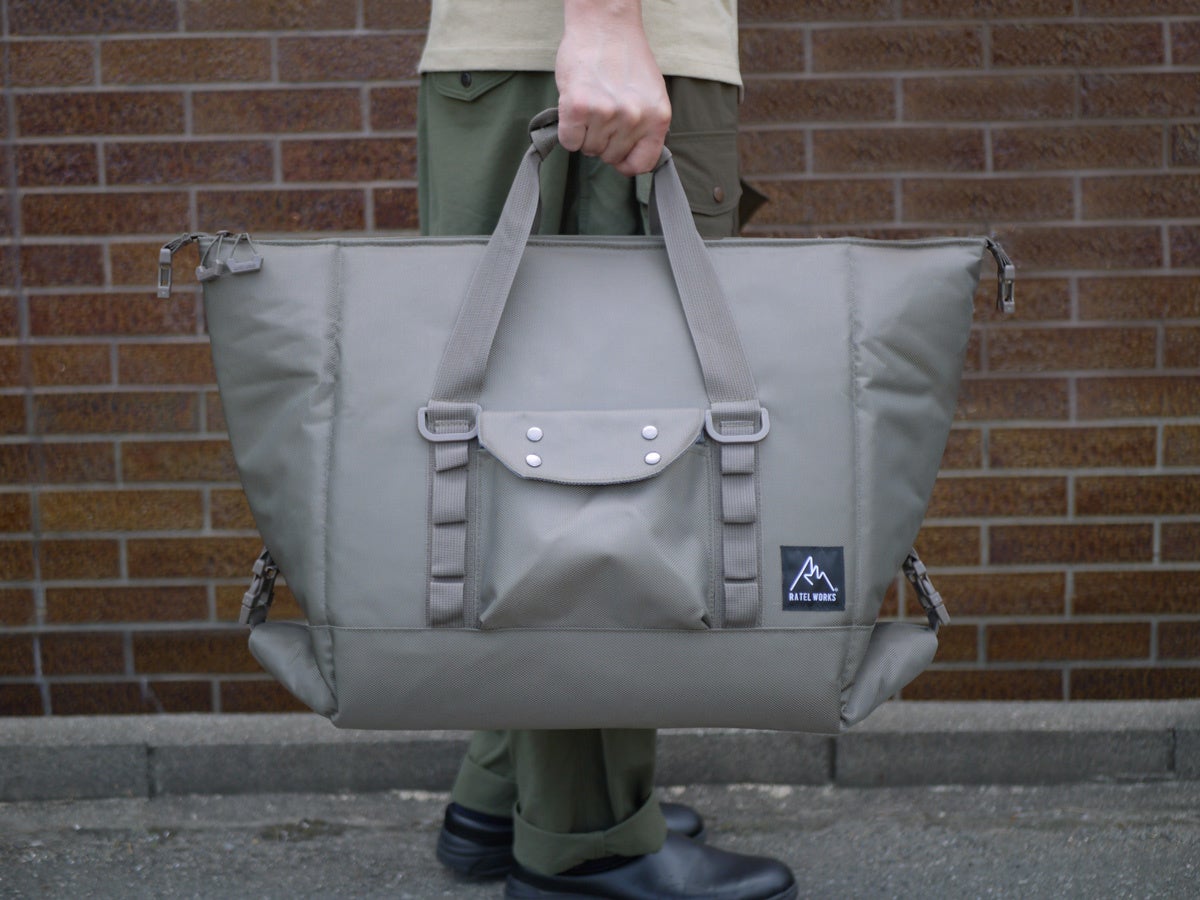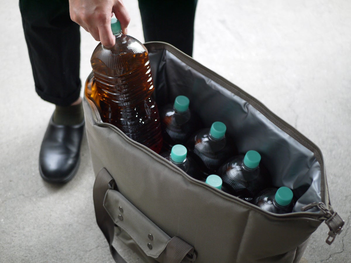 中に入れるものに応じて変形可能。食材を潰したくないときにはボックス型、飲み物だけや、出し入れが頻繁にある際にはトート型、また収納時はフラット型に変形する為、ちょっとした隙間に収納が可能です。