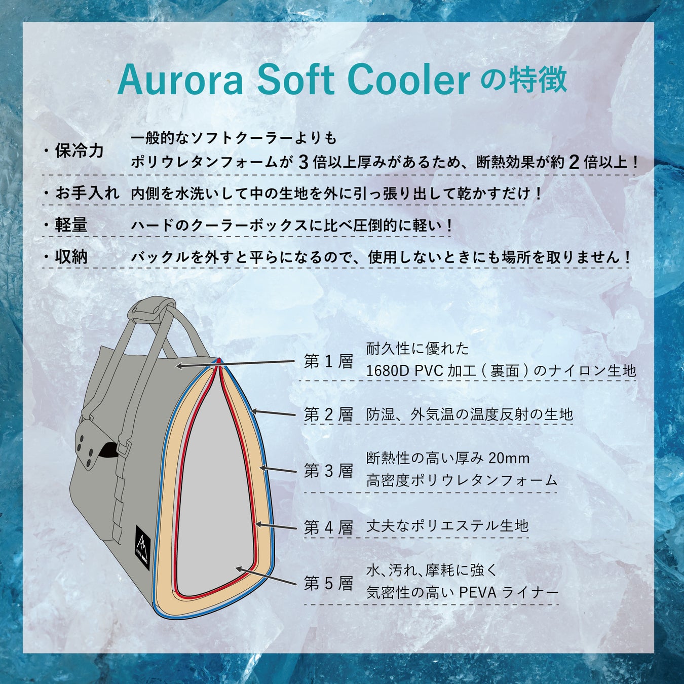 5層構造になっており、中でもウレタンフォームの厚みが20mmあります。一般的なソフトクーラーの3倍以上あり断熱効果は2倍以上です。また、表面の生地は1680Dで裏面をPVC加工することにより、より気密性が高く、温度反射に優れた製品に仕上がりました。