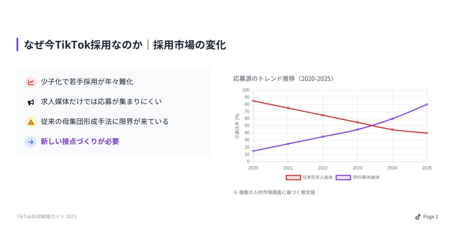 新卒採用の競争が激化する中、「今、TikTokをどう活用すべきか」が一冊で理解できる、採用担当者必携の資料です。