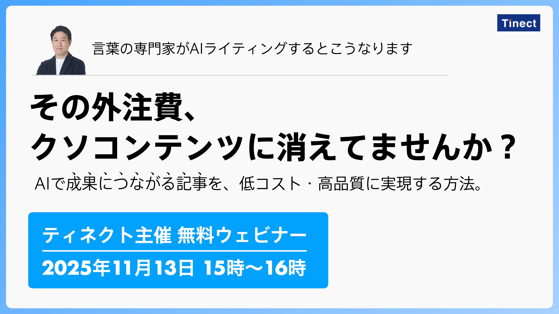 株式会社ティネクト(代表取締役:安達裕哉)は、2025年11月13日(木)にオンラインセミナー「その外注費、クソコンテンツに消えてませんか?」を開催します。参加費は無料。