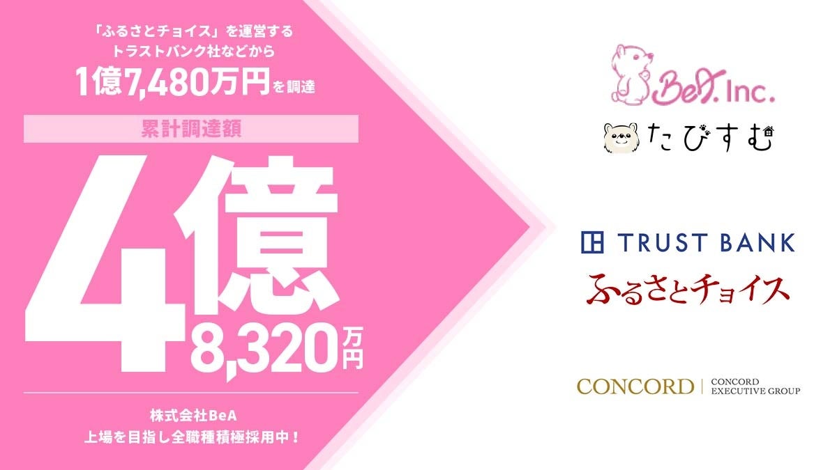 株式会社BeA(本社:東京都渋谷区、代表取締役:武内 大、以下「当社」)は、シリーズAラウンドにおいて、日本最大級のふるさと納税総合サイト「ふるさとチョイス」を運営する株式会社トラストバンク(本社:東京都渋谷区、代表取締役:川村 憲一、以下「トラストバンク社」)、株式会社コンコードエグゼグティブグループ(本社:東京都千代田区、代表取締役社長 CEO 渡辺 秀和、以下「コンコード社」)を率いる渡辺秀和氏を引き受け先とした1億7480万円の第三者割当増資を実施したことをお知らせいたします。(累計調達額は4億8320万円)