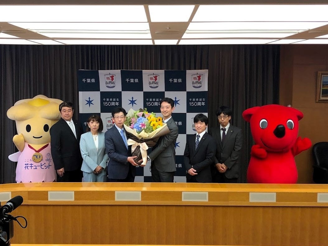 千葉県は今年2023年6月15日に誕生150周年を迎えました。6月11日には松戸市にて「千葉県誕生150周年記念行事オープニングイベント」が行われ、花キューピット千葉支部はイベント会場の装飾・販売ブースへ協力をいたしました。これに続き6月19日、日を改めて千葉支部代表者が千葉県庁を訪問し、熊谷 俊人知事へ150周年のお祝いとして花束を贈呈しました。