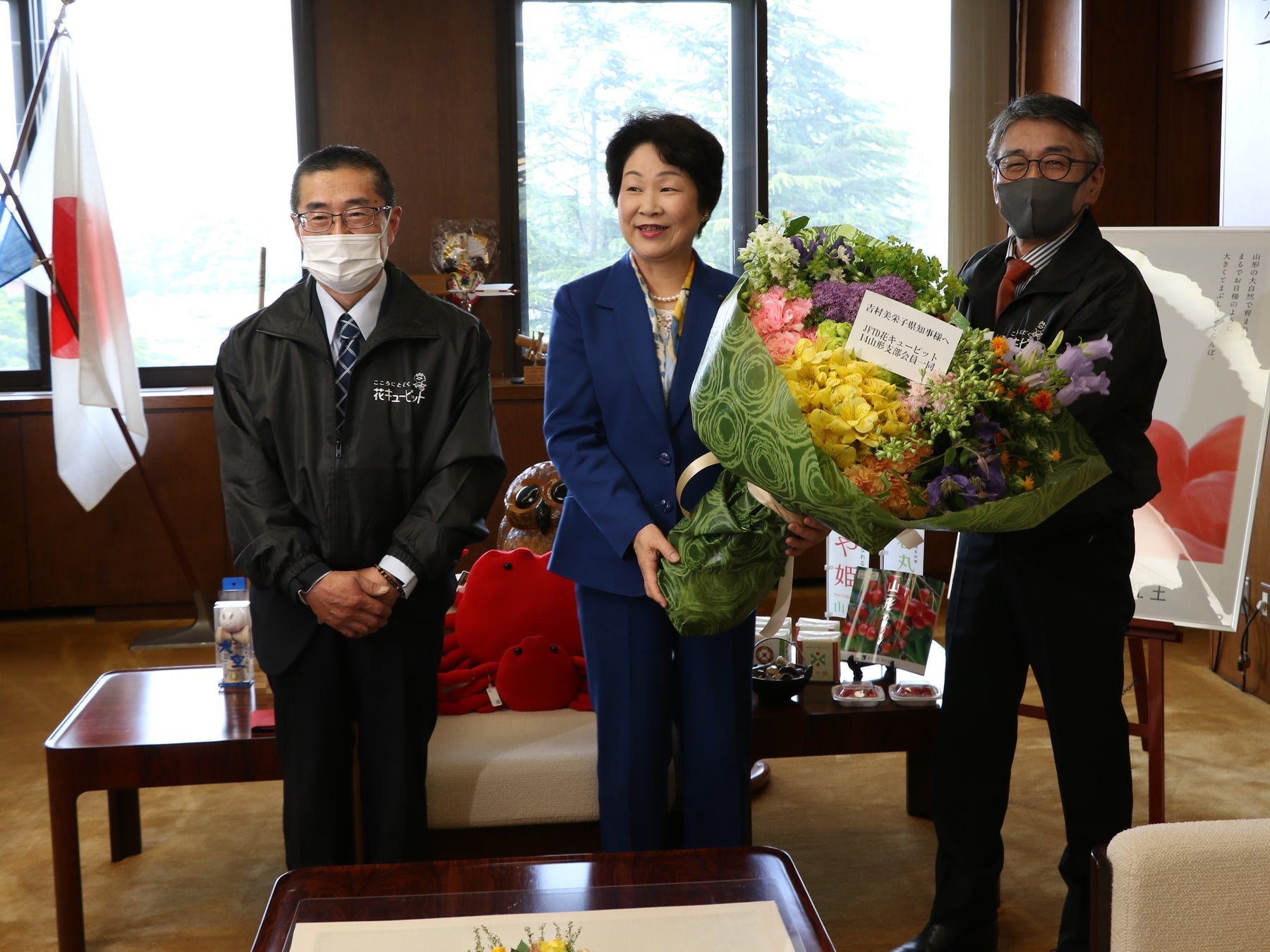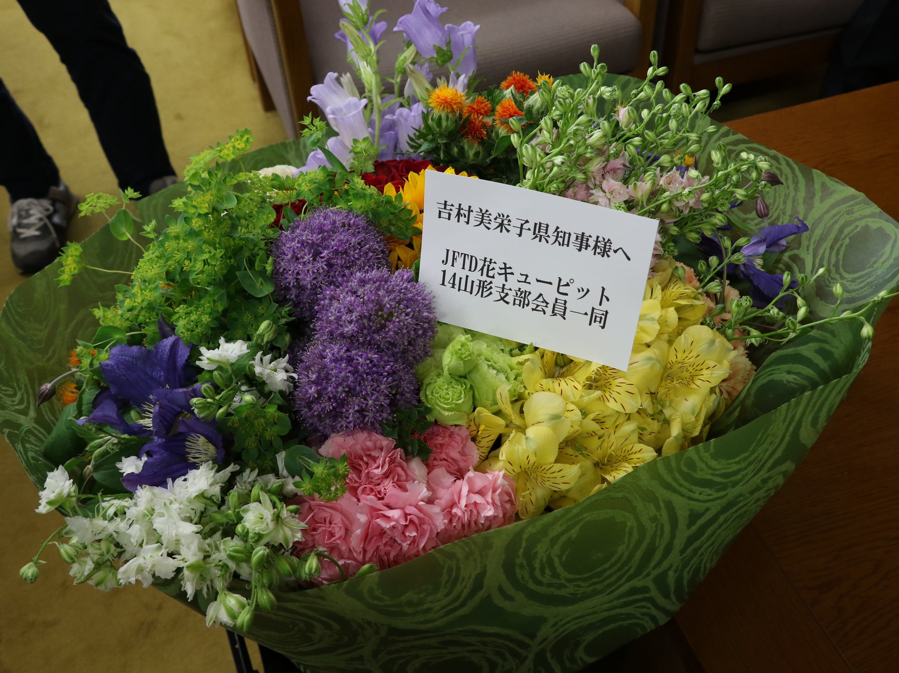 5月24日、山形支部代表者が県庁知事執務室を訪問し、5月18日に誕生日を迎えた吉村美栄子知事に花束を贈呈しました。花束は全て県産の花を使用し、バラ、ヒマワリ、アルストロメリア、リンドウなど10種類以上を束ねました。植物愛好家でもあるという吉村知事は、花束を手渡すと顔をほころばせ「この山形県が貴重な植物の宝庫であることを皆様に何かの形で知らしめたい」と話しました。また、県内生産者のためにも販売拡大は大事との言葉もいただきました。