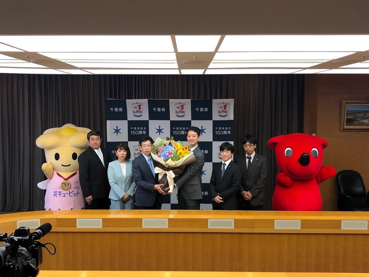 県庁では熊谷知事と一緒に千葉県マスコットキャラクター「チーバくん」が出迎えてくれました。花キューピット千葉支部は、ブランド・キャラクター「花キューピットちゃん」を同行し、両キャラクターも交えた懇談や記念撮影を行い、終始和やかな会合となりました。