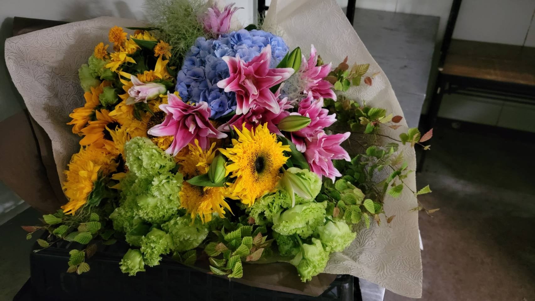 贈呈したのは県産のヒマワリ・姫ヒマワリ・トルコキキョウ・ユリ・アジサイの花束です。熊谷知事は八重や変わり咲きといった、ヒマワリの種類が豊富であることに感銘されていました。