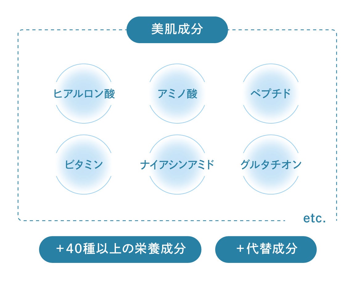 ヒアルロン酸やアミノ酸、ペプチド、ビタミン、ナイアシンアミド、グルタチオンなど美肌成分、栄養成分を40種以上含み、MPF製剤と80%は同じ成分で構成。残りの20%はセルフケアで確かな効果を感じながら安心してお使えいただけるように同効果の代替成分を用いました。