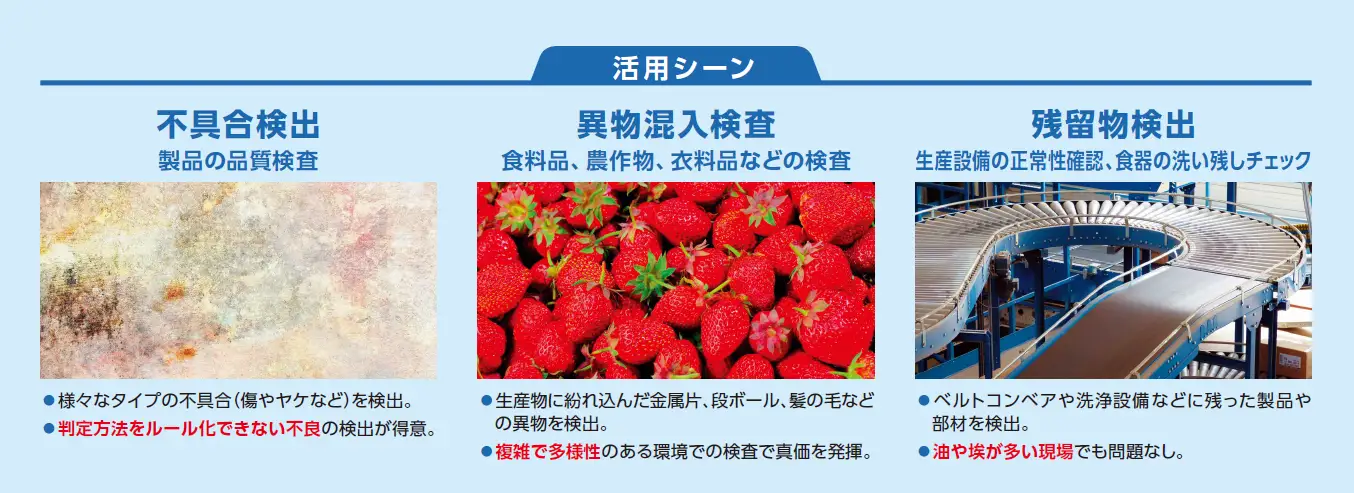 工業製品の外観検査、食品等の異物混入検査など、従来の画像検査処理では検出できなかった不良を、独自の画像処理AIの技術を使い、高速・高精度に検出できるパッケージソフトウェアです。今後の人手不足への対応や、検査品質の向上を図ることができます。