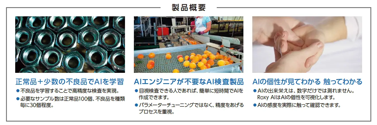 株式会社Roxy(2020年4月1日設立、代表取締役:石黒貴之)が開発、販売する Roxy AIは、少量のサンプルでも高い精度のAIモデルを短時間で作成できる、「現場で使いこなせる」AI検査製品です。