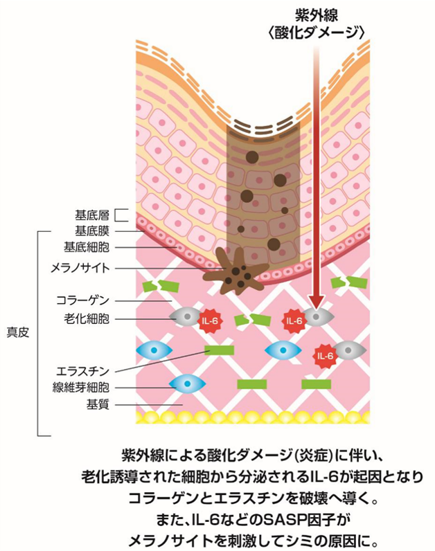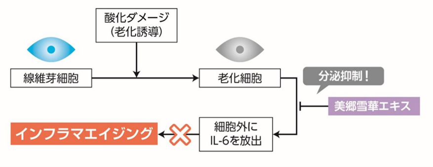 美郷雪華エキスには抗酸化活性を有することが確認されたことから、このエキスには紫外線や活性酸素種といった酸化ダメージを抑制する効果を持っているといえます。インフラマエイジングは炎症と老化がともに引き起こされることから、シワとシミの原因となり、生活の質(Quality of Life:QoL)を下げる原因にもなっております。我々はこのインフラマエイジングを解消する事で、抗老化効果を見出すことができると考え、SASP因子をスクリーニングし、そのうちの一つであるIL-6と美郷雪華エキスの関係に着目しました。