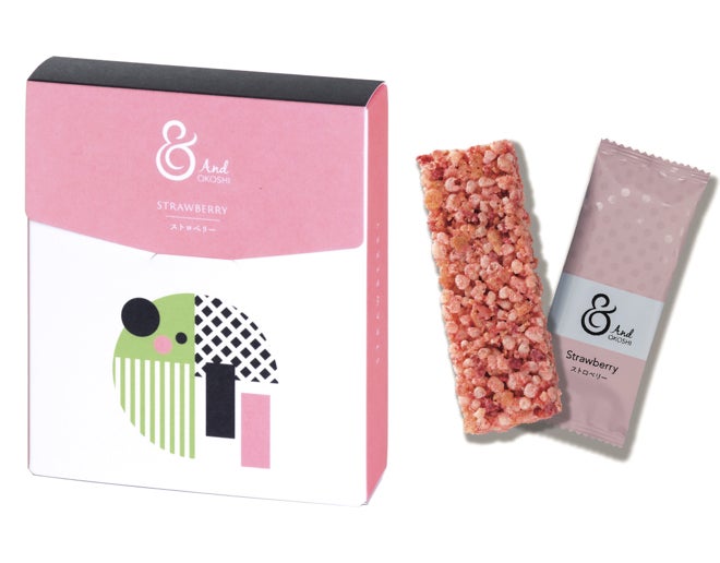 水あめをつなぎに使用した「& ORIGIN」は、昔ながらのオーソドックスな製法で作られた”歯応えのある食感”のおこしなので、背景のモチーフは「四角」に。一方、チョコレートでまとめたしっとり食感が特徴の「& NEO」では、背景のモチーフが丸になっています。また、それぞれ右下の長方形は &OKOSHIそのものを表現しています。