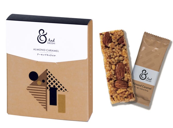 リニューアル後の単品パッケージは、スタイリッシュで気軽にシェアしやすいよう箱上部が大きく開く形状を採用、またデザインでは「& OKOSHI」の特徴である「様々な素材や食感が組み合わさってハーモニーを生み出している」イメージを、抽象的な形を組み合わせたマークで表現しています。