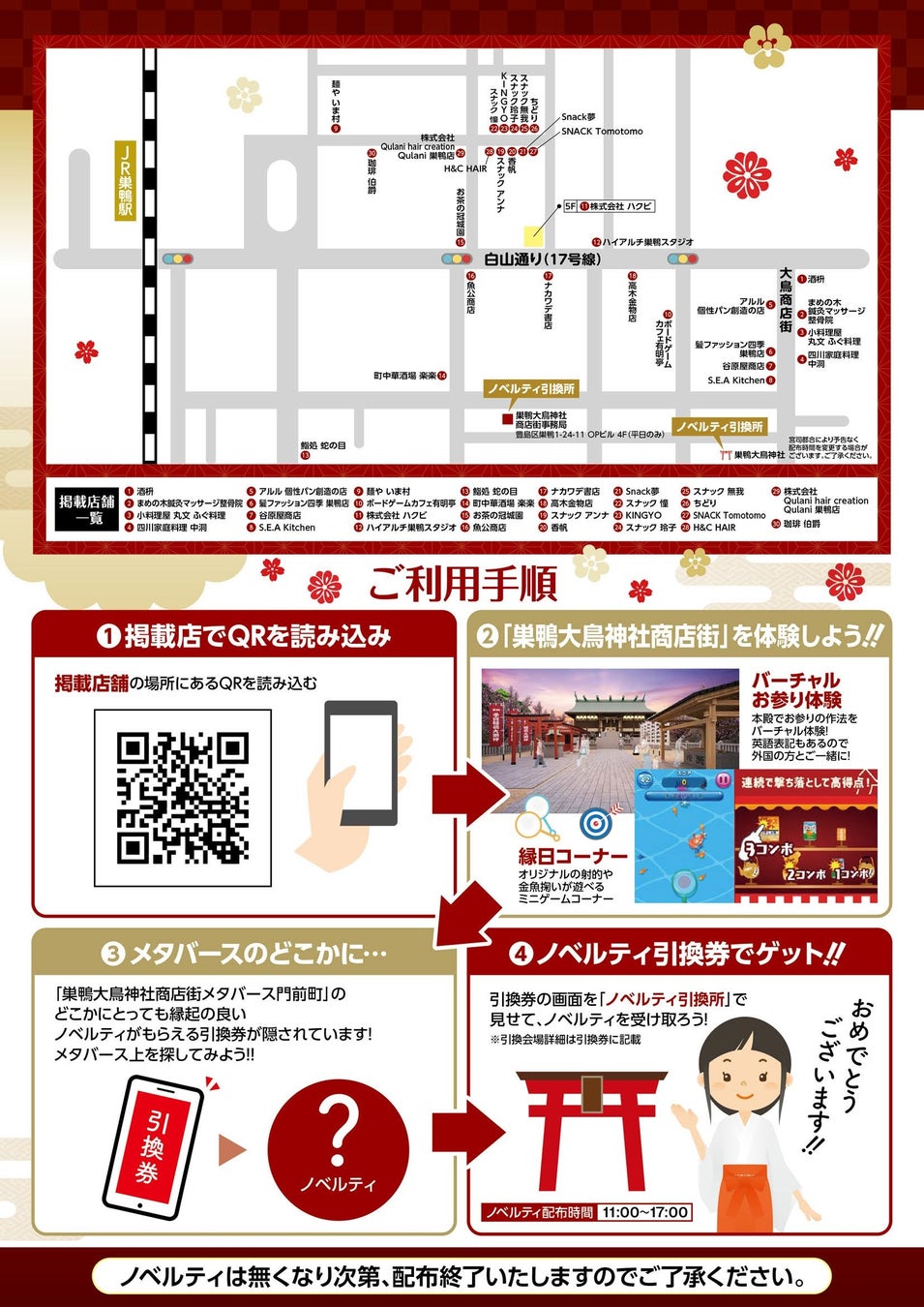 開催中のメタバース空間へは「巣鴨大鳥神社商店」内の店舗にある案内か下記に掲載されているQRコードよりアクセスください。