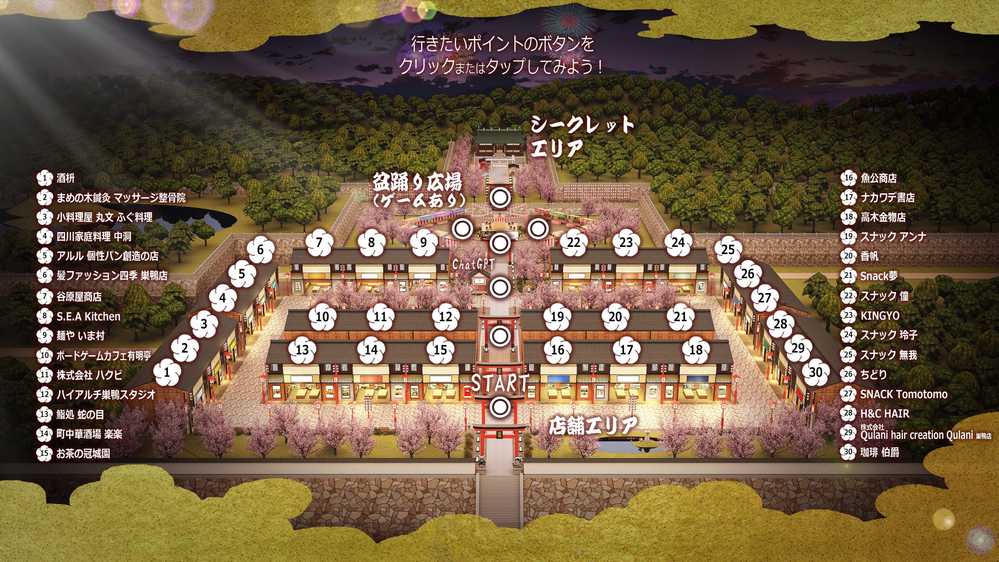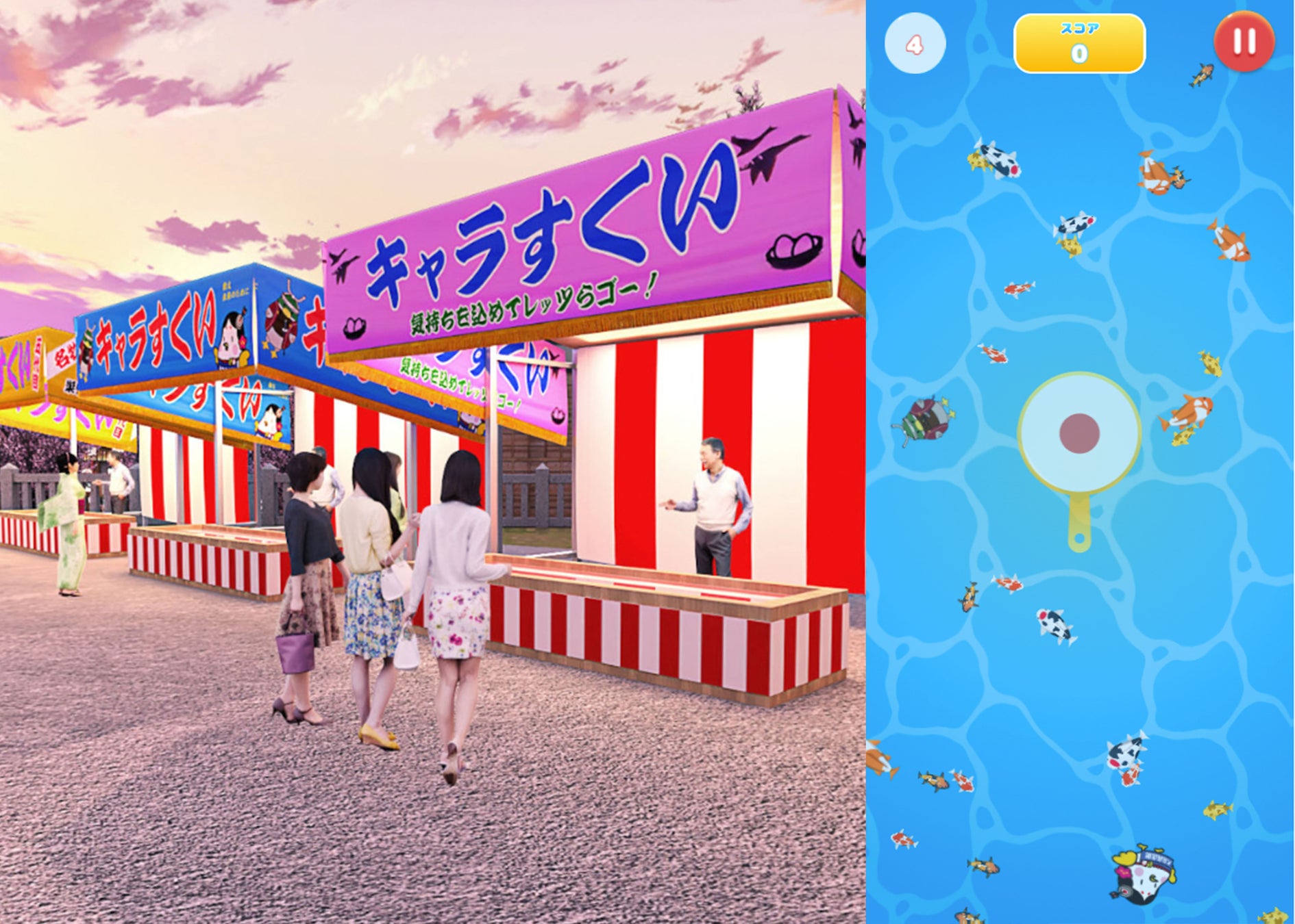 会場中心の広場では心地いい「巣鴨花咲音頭」が流れます。 一際目立つ大きなモニターでは、当商店街の紹介動画と、毎年リアルイベントとして開催される、伝統の「巣鴨盆踊り」の様子を発信します。盆踊り広場の周りでは、巣鴨大鳥神社商店がお馴染みのキャラクターをモチーフにした「縁日コーナー」で楽しいミニゲームを遊ぶことができます!