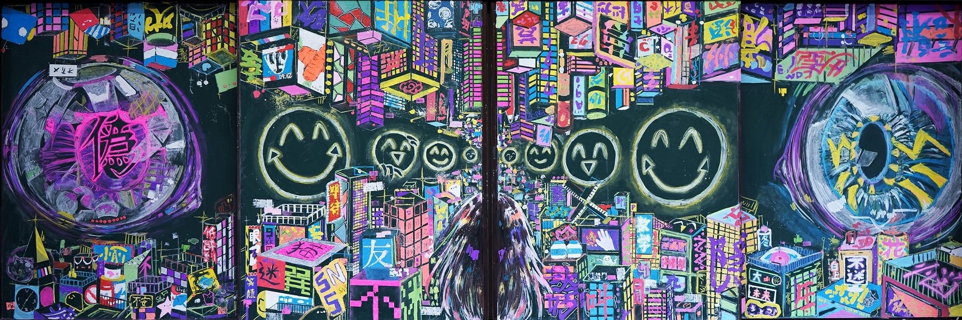 作品を一目見た時のインパクトもさることながら、多色使いとチョークの形状を変化させることで表現できる可能性と、立体が多いのにうるさく感じないまとまり感には圧倒されました。また、看板など細部まで描かれた作品へのこだわりが見る人に驚きと感動を与えてくれる作品です。鮮やかな色彩と作品への想い、構図を見入ってしまう魅力は最優秀賞にふさわしく、感銘を受けました。