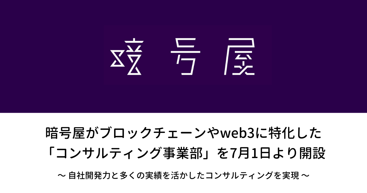暗号屋(本社:福岡県福岡市、代表:紫竹佑騎)は、ブロックチェーンやweb3に特化した「コンサルティング事業部」を2022年7月1日(金)に設立しました。