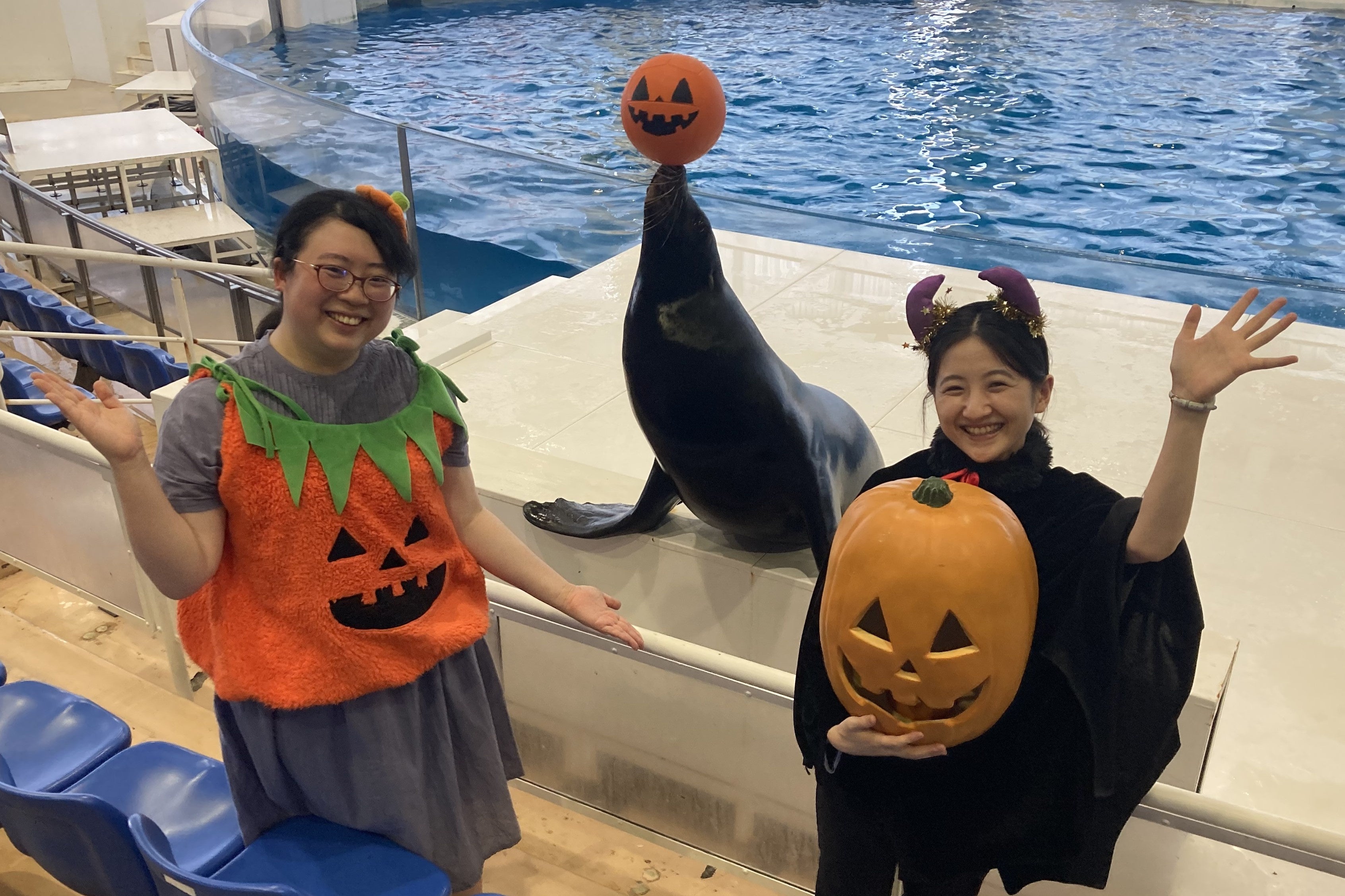 ご来館の記念にカリフォルニアアシカと一緒に写真撮影はいかかでしょうか。目の前にやってきたアシカが、ハロウィングッズを用いて華麗なポージングも披露してくれます。