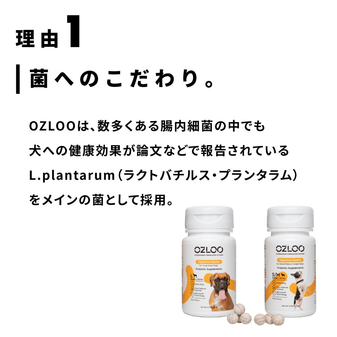 販売されている整腸剤の中で、一番気になるのは、効果が実感できるか。その鍵をにぎるのは、整腸剤に含まれる“腸内細菌”です。OZLOOは、数多くある腸内細菌の中でも犬への健康効果が論文などで報告されているL.plantarum(ラクトバチルス・プランタラム)をメインの菌として採用。また、腸内細菌同士がお互いのはたらきを邪魔することが無いように、複数の腸内細菌をやみくもに含ませるのではなく、シンプルな配合。L.plantarum(ラクトバチルス・プランタラム)と相性がよく、相乗効果が特に期待できる“L.casei(ラクトバチルス・カゼイ)”との2種の組み合わせの2種の組み合わせになっています。