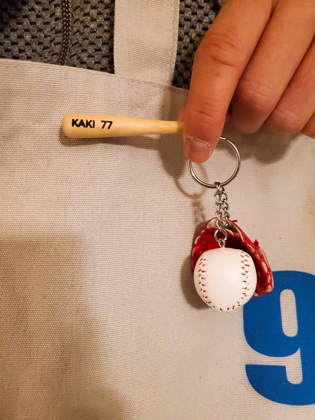 トートバッグだけでなく、ベースボールキーホルダーにも好きなネームやナンバーを刻印できます。