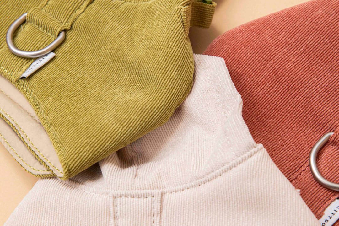 今回、秋冬の新作として発売する「コーデュロイハーネス」は、洋服が苦手な愛犬でもお洒落が楽しめる洋服一体型ハーネスです。コーデュロイの特徴でもある表面の凸凹や畝を細かくすることで「CITYDOG」らしく上品な印象に仕上げました。着脱しやすいマジックテープとバックル仕様で、実用性とお洒落さを兼ね備えたアイテムです。