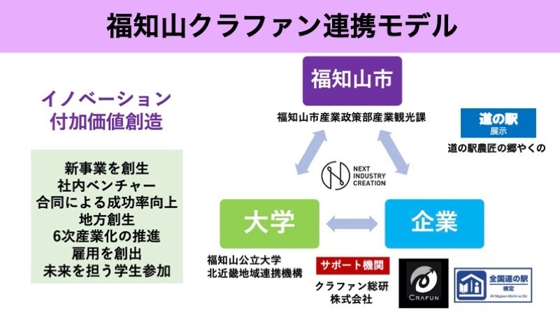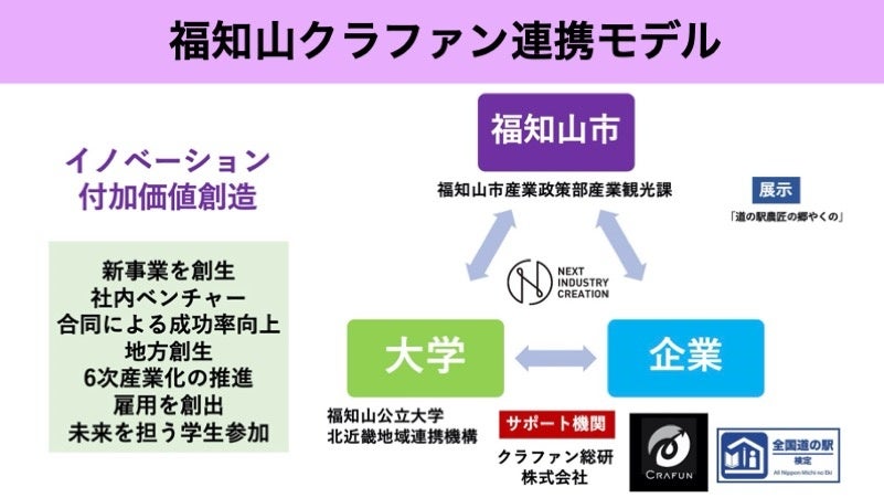 今回、日本初となる「クラファン®︎」と「道の駅」の連携の取組として、クラファン®︎期間中に返礼品の展示を「道の駅農匠の郷やくの(やくの高原市)」において実施します。この取組は、「産官学」・「クラファン®︎」・「道の駅」を連携することで、新事業の創生や社内ベンチャーの育成につながり、また、複数起案合同による協力体制のもと、スタートアップの成功率向上が期待されます。これにより、地方創生や6次産業化が推進されるとともに、雇用の創出、学生参加による未来を担う人材の育成につながると考えています。この取組を「福知山クラファン連携モデル」と称し、当社では今後も各地で「クラファン®︎」・「産官学」・「道の駅」の取組を推進して参ります。