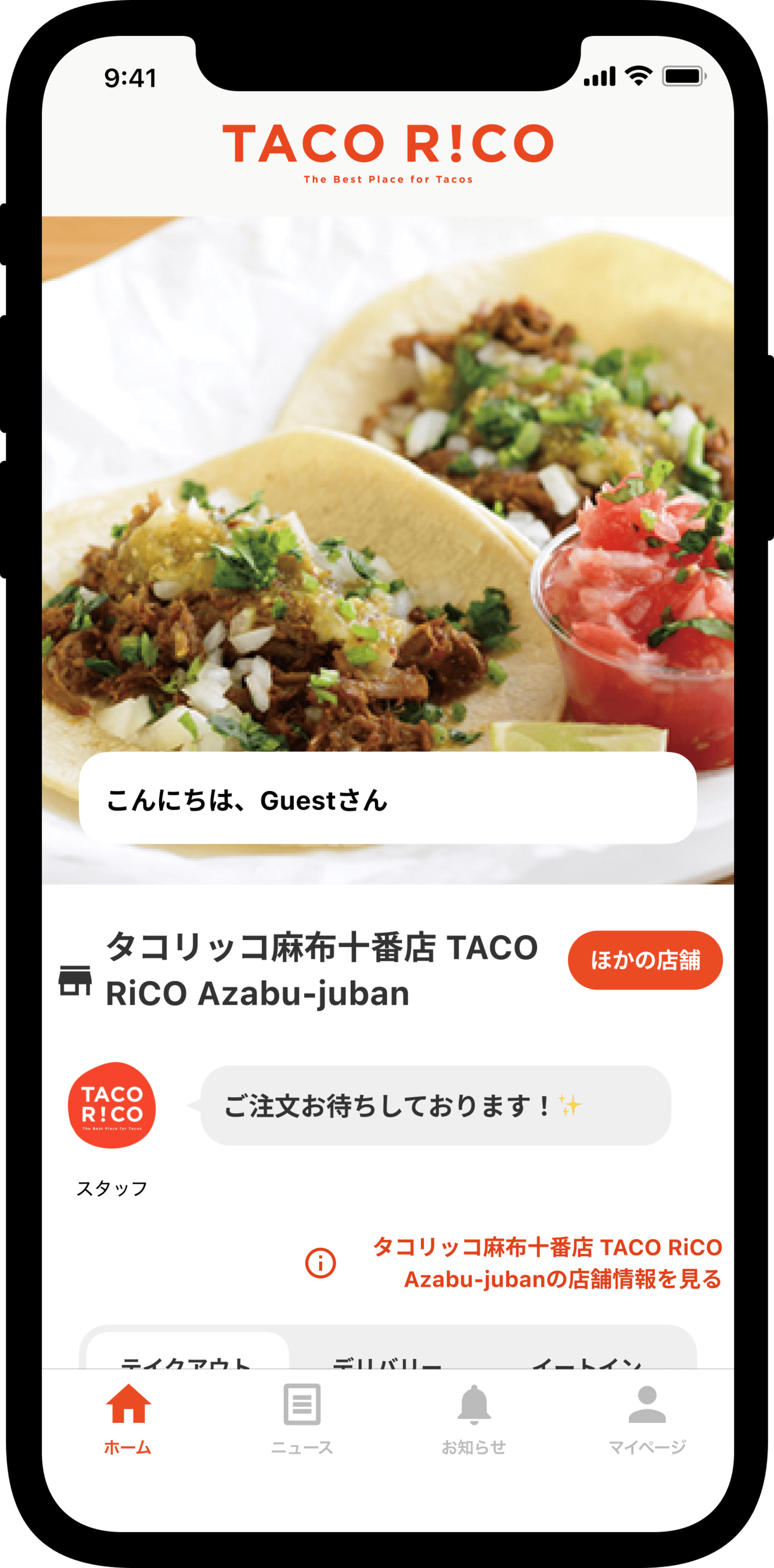 2023年2月より、「TACO RiCO」の麻布十番店にて、当社の「All in One」モバイルオーダーアプリの仕組みを活用した「TACO RiCO」公式アプリが導入・運用開始されました。アプリ導入により、店頭でお客様をお待たせさせずに提供でき、さらに顧客とダイレクトにつながることで、より効率的な顧客管理、マーケティングが可能になります。イートイン・テイクアウト、デリバリーすべての注文チャネルの注文から決済、顧客管理までを一括管理でき、業務効率化によって、接客や調理により集中できる環境を整えながら、顧客満足度やロイヤリティを向上させるDXを実現します。