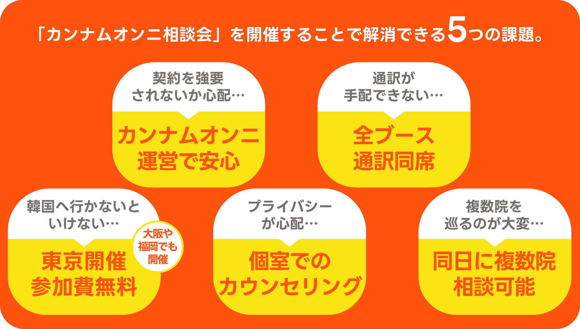 韓国の美容整形外科を調べる多くの人が、すでにカンナムオンニをご利用してくださっていることから、自分たちが誘致する美容整形外科であれば、韓国に行かずとも、安心してカウンセリングを受けて頂けると考え、「カンナムオンニ相談会」を開催しております。