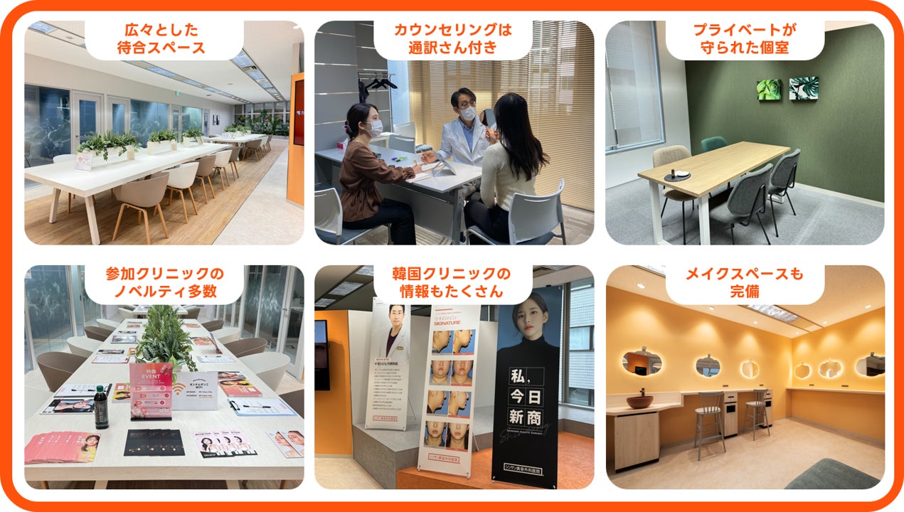 アクセスを考慮し東京・渋谷駅から徒歩5分、道玄坂エリアに「カンナムオンニ相談会」専用会場をOPEN。閉鎖感を緩和しつつ、プライベートを保ったカウンセリングルームを複数用意するとともに、韓国クリニックの最新情報が得られるPOPスペース、参加者へのノベルティなどを用意しております。