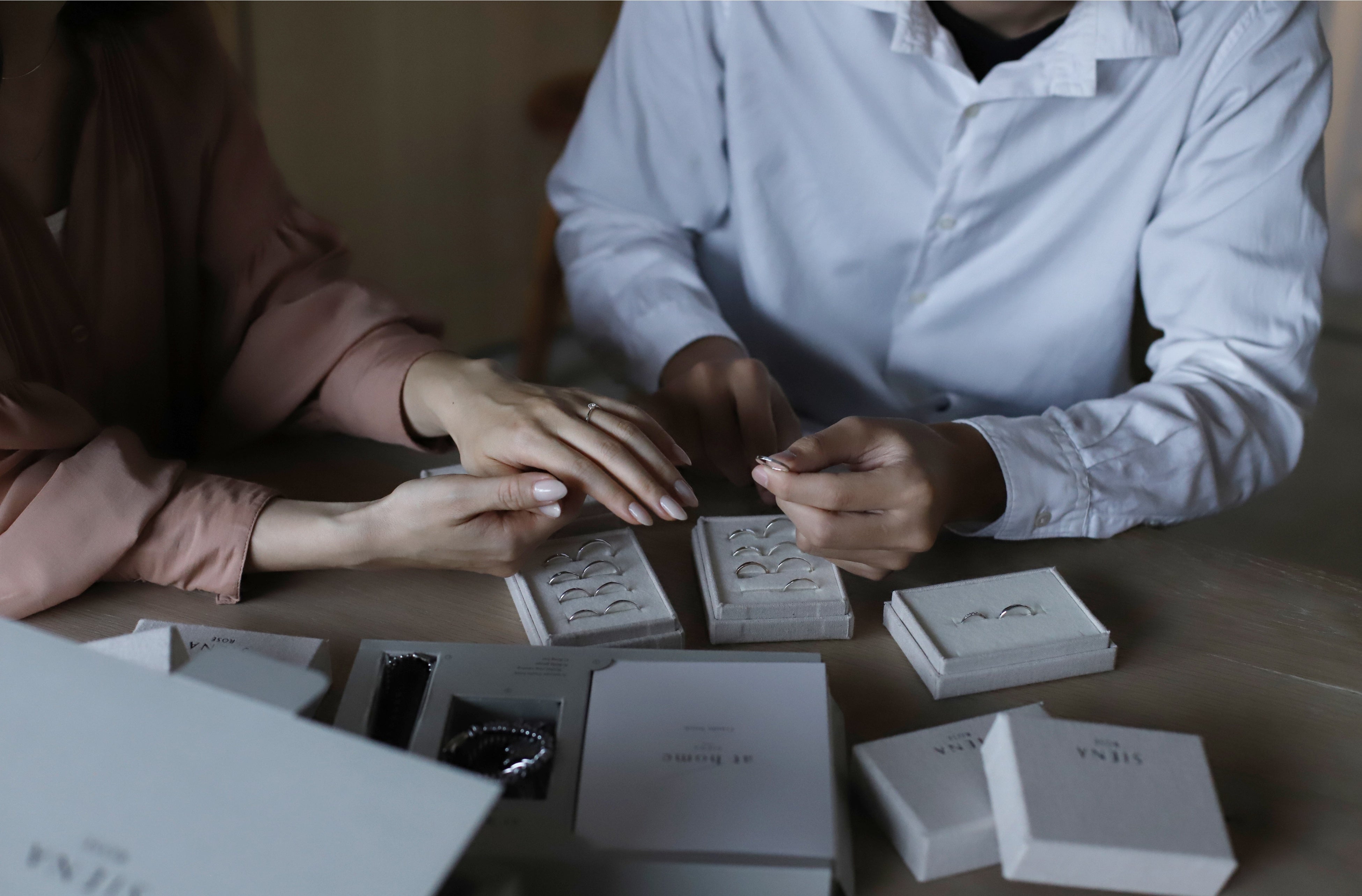 国内ジュエリーブランド『SIENA ROSE(シエナロゼ)』が展開するブライダルラインのオンラインサービスです。ECサイトで全50種類からブライダルリングのお好みのデザインを最大6型まで選んでお申込みいただくと、数日でご自宅にお試し用のサンプルリングが届き、7日間の貸出期間で自由にご試着をお楽しみいただけます。キットの中にはサンプルリングの他にカタログや素材見本、ご自身で指のサイズを測ることが出来る測定器具も同梱しています。ご希望のお客様にはビデオ通話を使用しての無料オンライン接客も実施しており、ECサイトからリングのご購入も可能なため、ご試着からお受け取りまでを全てご自宅で完結できる点でご好評をいただいています。