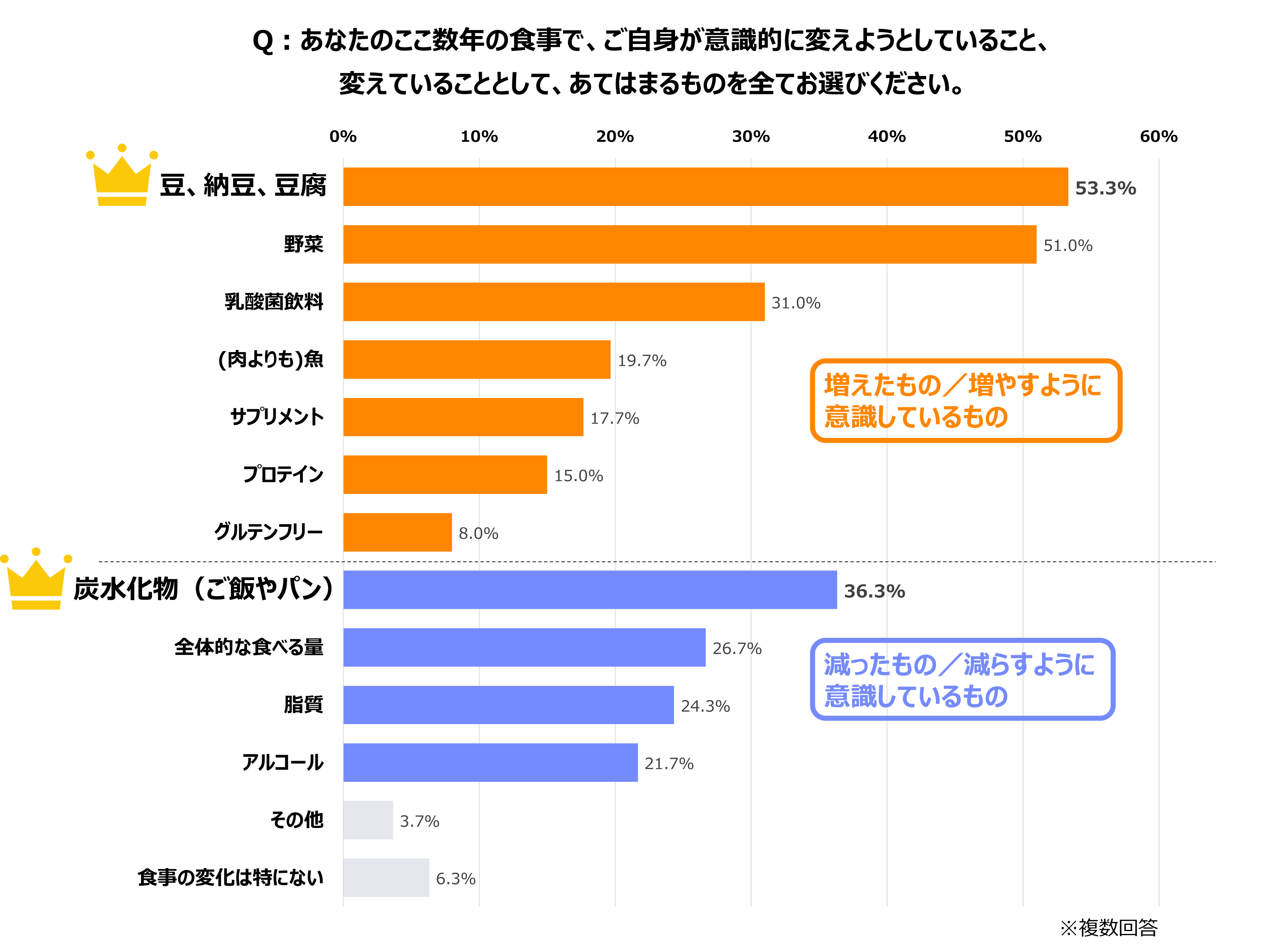 ここ数年で意識的に変えようとしている食生活に関しては、豆、納豆、豆乳、次いで野菜、乳酸菌飲料の摂取を増やす人が増えています。