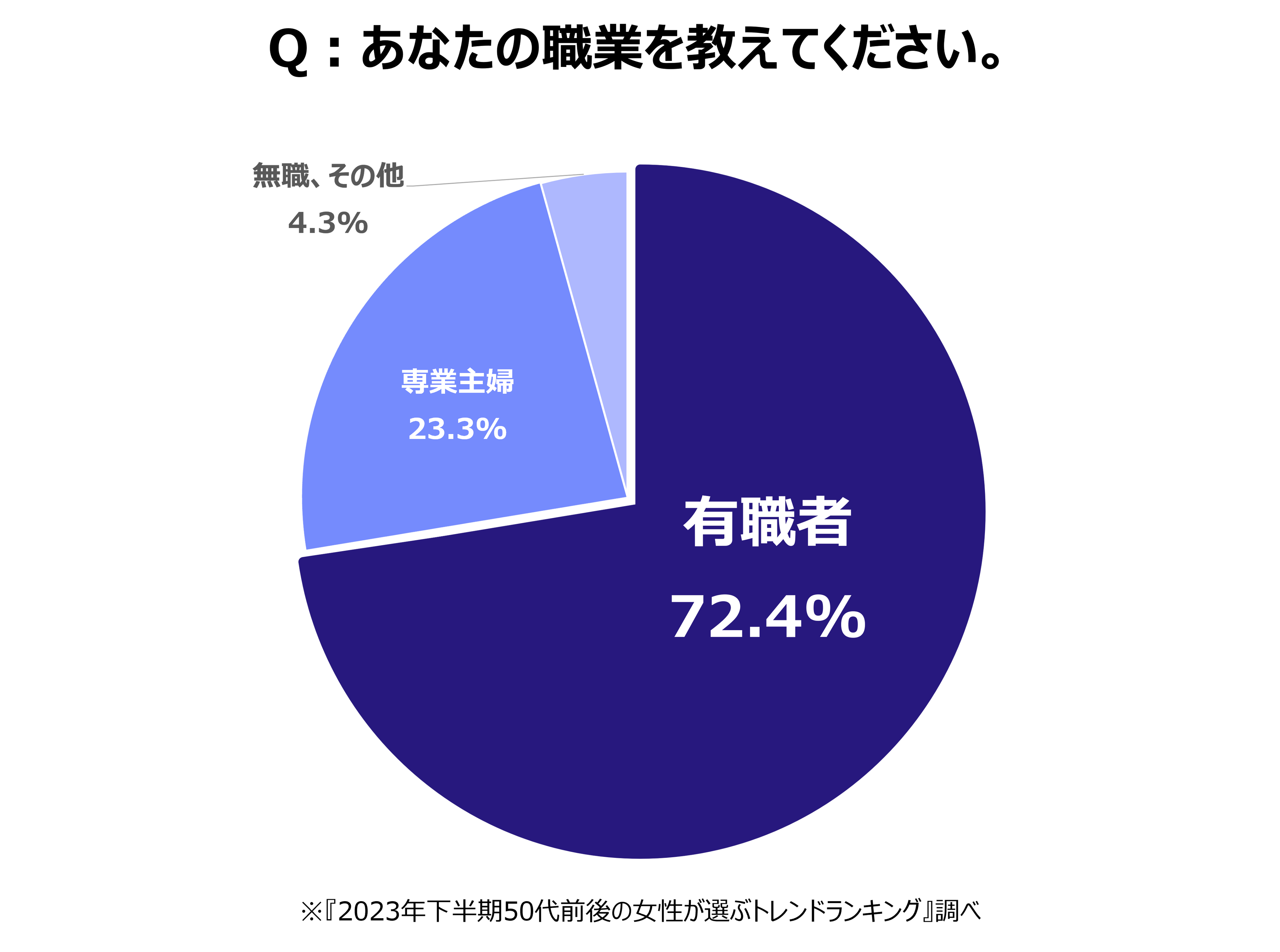 株式会社アットテーブルは食のトレンドや市場、生活者の行動・意識調査、食卓データなど、 独自の「食マーケティング」を基盤に、スーパーマーケット様や食品メーカー様の課題 解決のサポートをしております。その中で小売業様、食品メーカー様の商品開発、プロモーション等の方向性を導くため、全国の主婦5,000人の生活実態やマインドを毎月調査。主婦の“今”や“リアル”を調査分析しております。この度、人口統計で50才以上の女性の人口が全女性人口の半数以上になった事を受け、今後の市場をリーディングするであろう新しい購買層として50代前後の女性に注目。50代前後の女性の流行に関する意識調査を行いました。