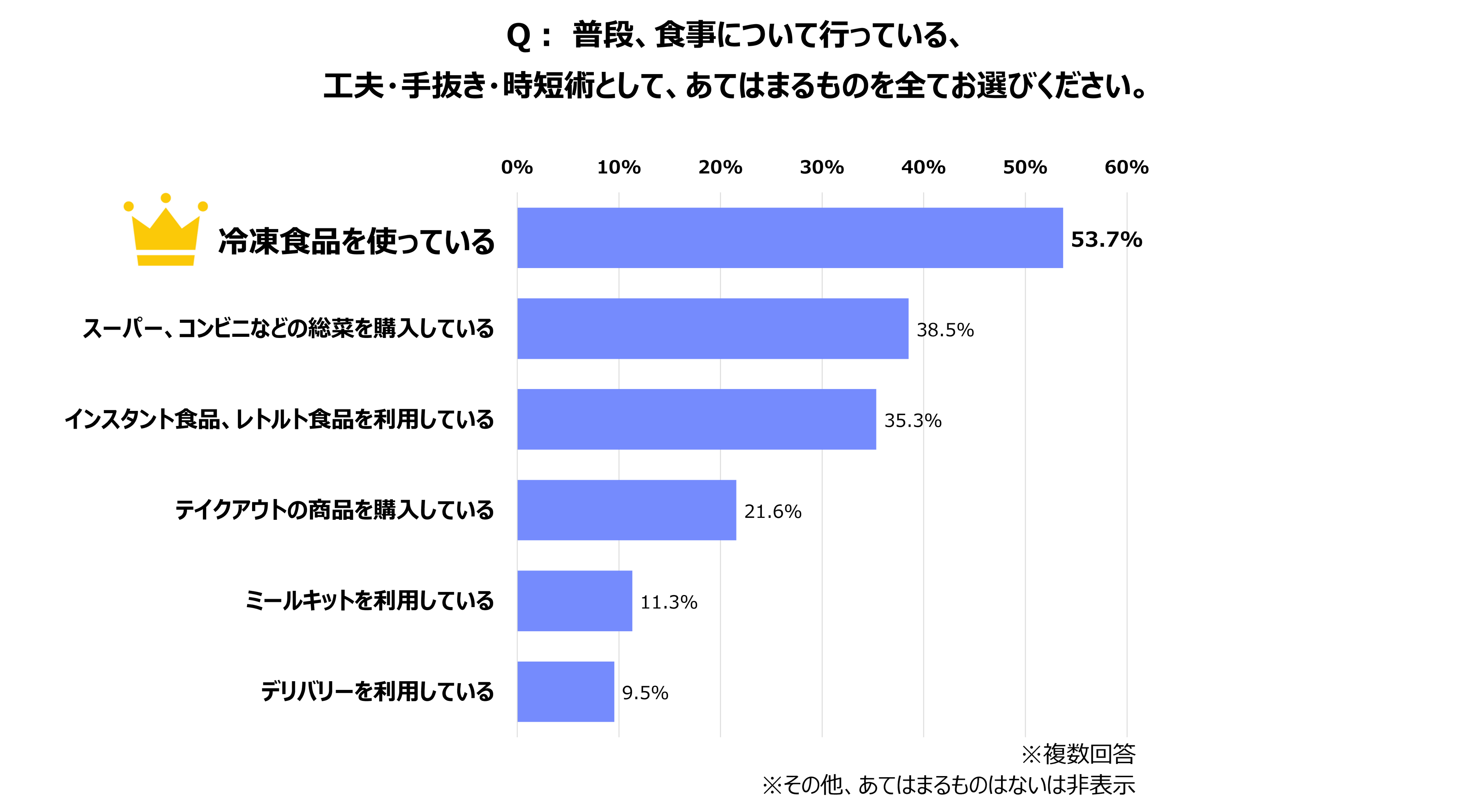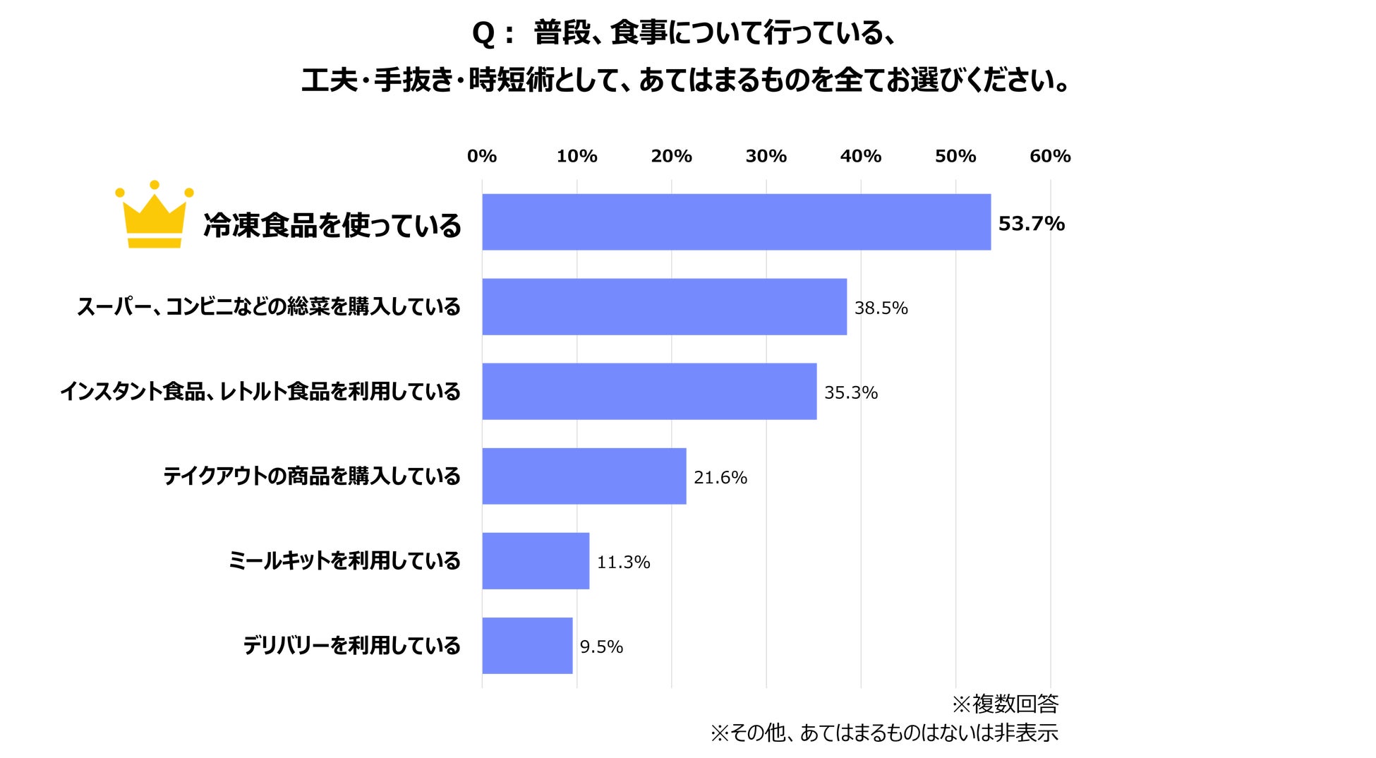 冷凍食品の利用が53.7%と半数以上、スーパー、コンビニなどの総菜利用が38.5%、レトルト食品利用が35.3%と、多くの方が日常的に冷凍食品や総菜を利用しているのがわかります。