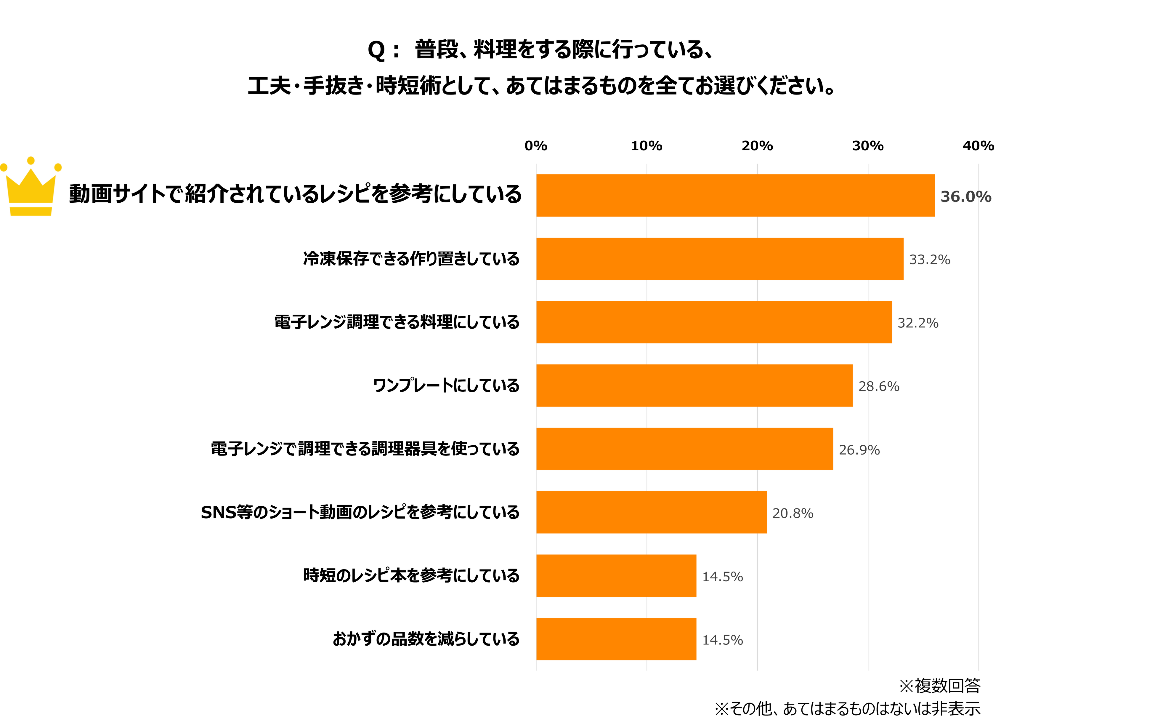 調理方法や食べ方に関しては、「動画サイトで紹介されているレシピを参考にしている」という回答が36%、「冷凍保存できる作り置き」が33.2%、「電子レンジで調理できる料理にしている」が32.2%、「ワンプレートにしている」が28.6%と、電子レンジ調理や、動画レシピの利用が一般的になってきています。