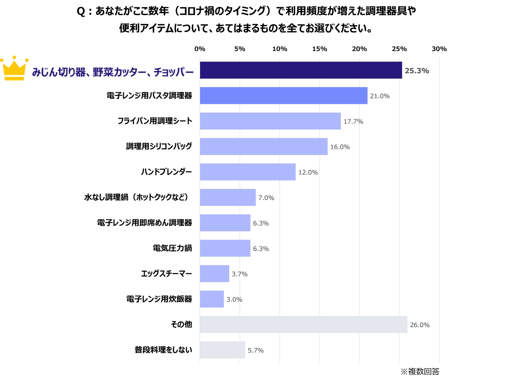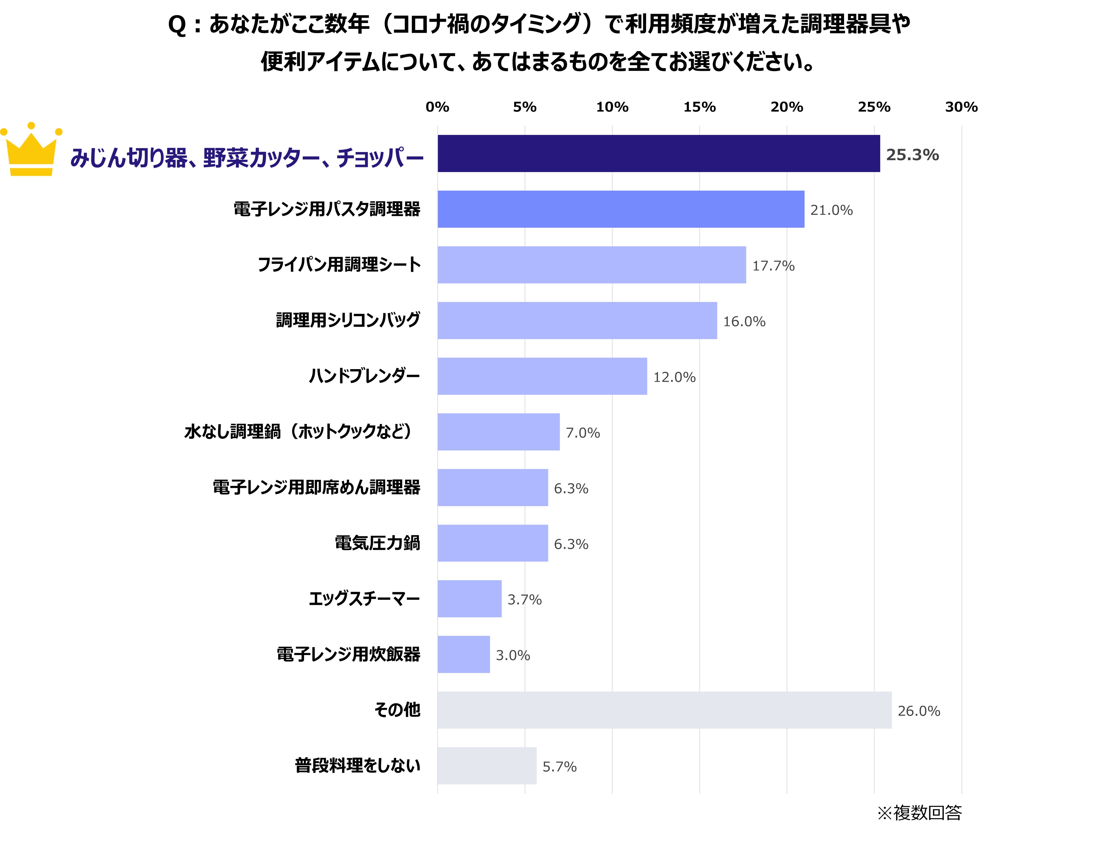 1位はみじん切り器・野菜カッター・チョッパー(25.3%)、次いで電子レンジ用パスタ調理器(21.0%)、フライパン用調理シート(17.7%)が続きました。料理をする上で面倒なみじん切りや、鍋・フライパン・グリルなどを洗う手間が省ける”簡単調理器具”を日常的に使うようになってきています。また、電子レンジ用即席めん調理器や電子レンジ用炊飯器など、電子レンジで調理できる調理器具もあがってきており、電子レンジが鍋、フライパンなどの調理器具と同等またはそれ以上に利用されている事が伺えます。