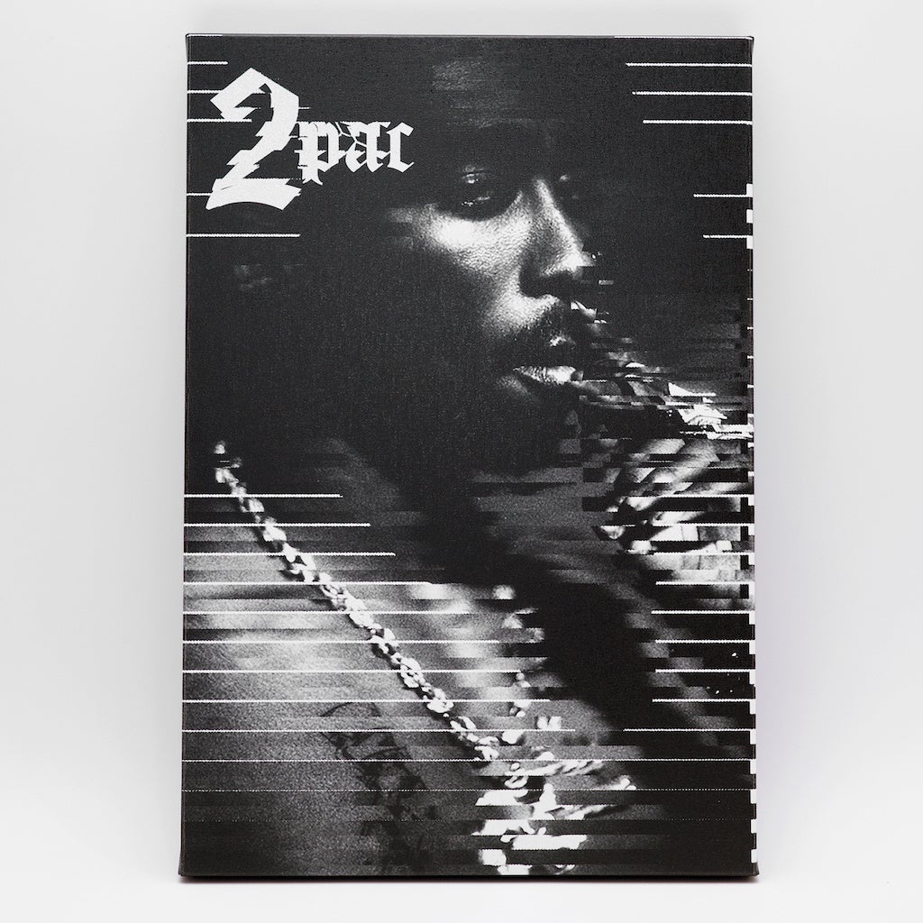 本展では、2Pac財団が保有するアーカイヴ写真の中から河村康輔が選び抜いた3枚の写真を素体とし、シュレッダーコラージュにて分解と再構築を施した作品が並びます。それらの作品は、ユニバーサルミュージックのグループ会社であるBravadoを通じた交渉による2Pac財団(The Shakur Estate)からの公認のもと、日本の技術力で顕在化され、RICOHの2.5次元立体特殊プリント”StareReap(ステアリープ)”作品、360°GRAPHICSのネオシルクキャンバス作品、トレーディングカードに着想を得たネオシルクキャンバス作品が組み込まれたアートカード等、新たなアート作品に触れて頂ける内容になっています。