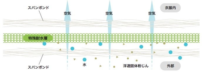 本製品の生地は、東レが2021年に開発したもので、緻密性の高い特殊耐水層(メルトブロー不織布)を、耐久性の高いスパンボンド不織布で挟み込んだ3層構造です。特殊耐水層の不織布を極めて緻密な構造に制御することにより、粉じん防護性に加え、従来のSMS(スパンボンド・メルトブロー・スパンボンドの3層不織布)製法では難しかった耐水圧1,000mmH2O※1を実現しながら、約7cc/cm2・secの通気性を併せ持ちます。
