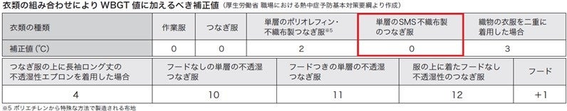 通気性の無い素材を使用した防護服など、着用する防護服の種類によっては、作業現場で計測したWBGT 値に、下記表の着衣補正値を加える必要があります。