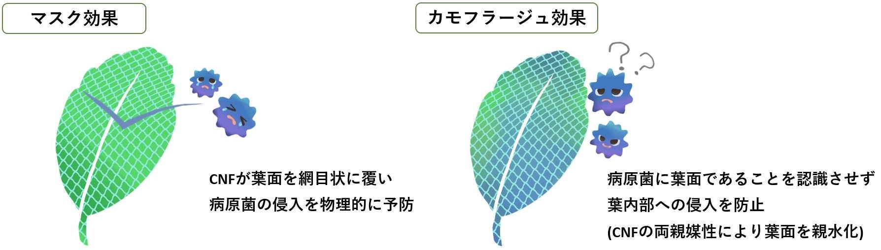 CNF が葉面に付着することで、葉内部への糸状菌や細菌の侵入をブロックします。