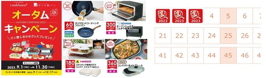 クックハウスとダイヤ製パンは、ポイントを集めてもれなく素敵なプレゼントがもらえるオータムキャンペーンを9月1日(金)から3ヵ月間行います。このキャンペーンは40年以上前から続き、日頃の感謝をお客様に改めてお伝えする期間であり、毎年楽しみにしてくださるお客様も多いキャンペーンです。