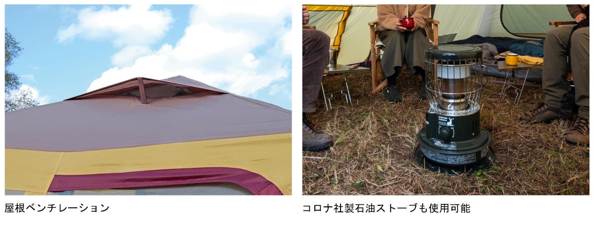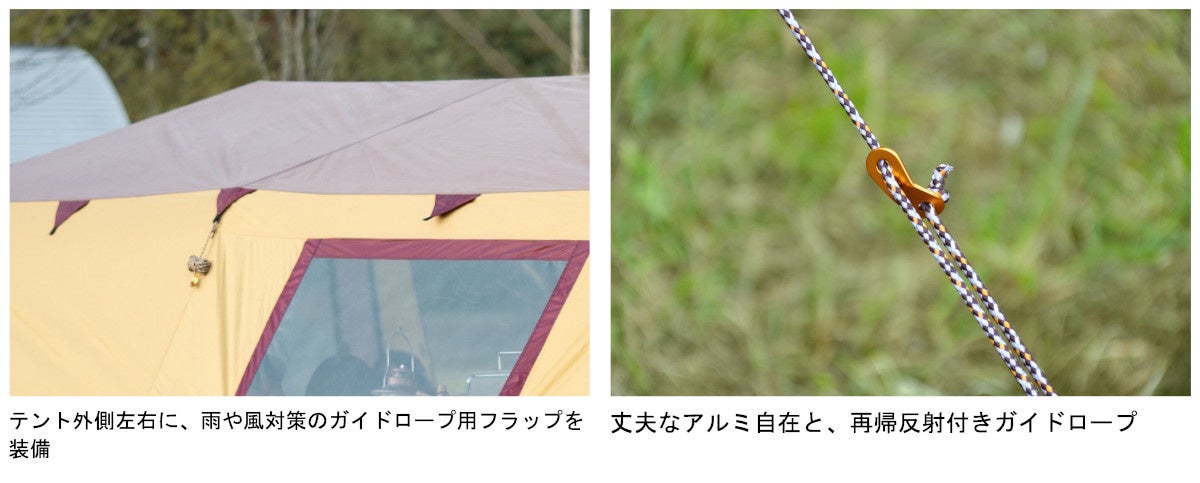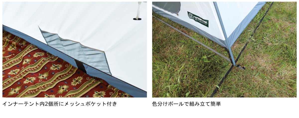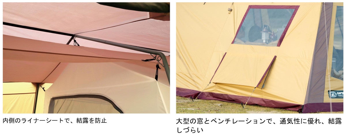 クラシックなロッジ型テントの美学を踏襲しつつ、往年のデメリットを解消した進化版。その堂々たる外観は、キャプテンスタッグの伝統的なスタイルを受け継ぎつつ、最新の構造と快適装備を備えています。