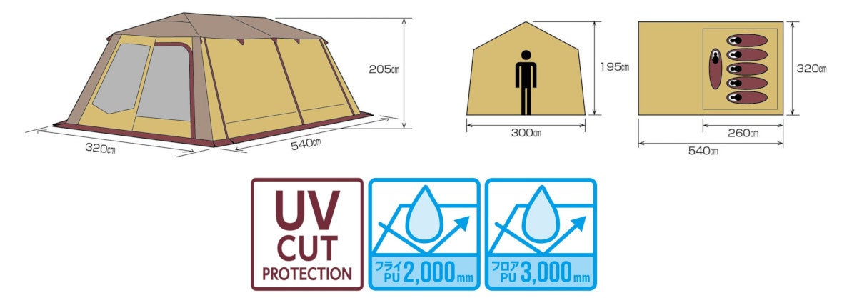 製品サイズ(約) | フライ:320×540×H205cm インナーテント:300×260×H195cm |