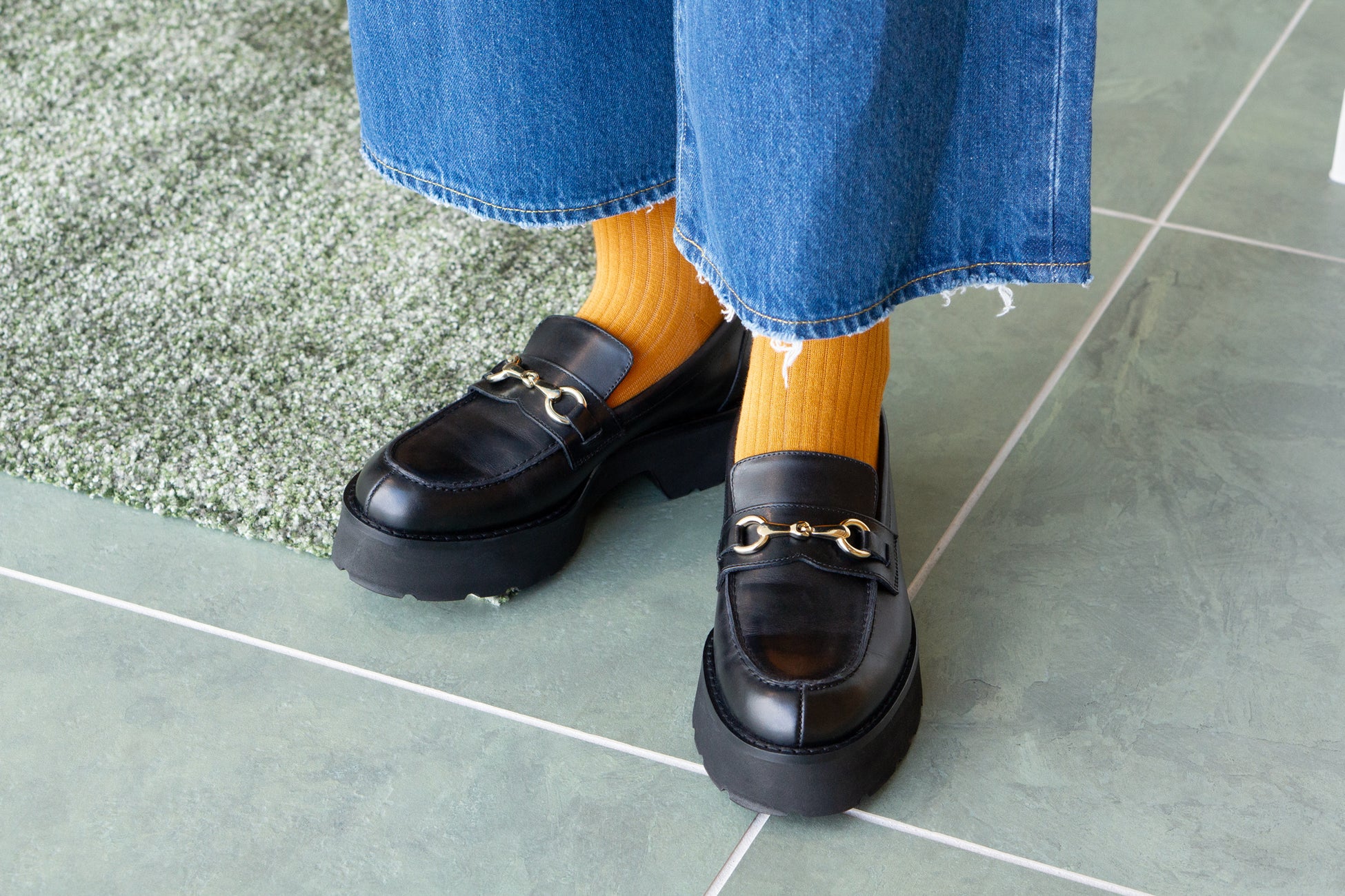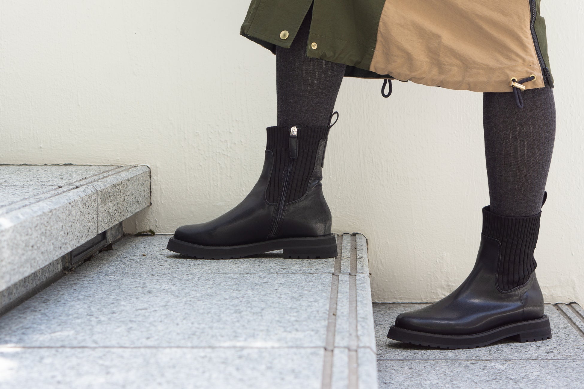 立体的なリブ編みが、足元に表情を付けながら、縦ラインで脚を美しく引き締めて魅せます。