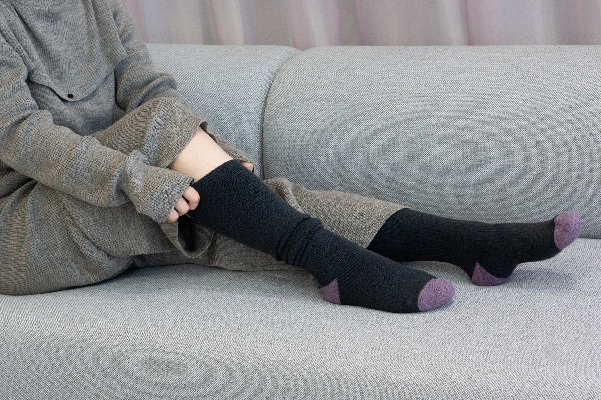 2023年10月に発売したコンプレッションソックスは、上質な素材を用いたファッションソックスでありながら、一般医療機器として緻密に設計された段階着圧設計が特長。重力の影響を受けやすい日中の時間に履くだけで、血行やリンパのながれを促進し、つらい脚のむくみを予防、軽減します。